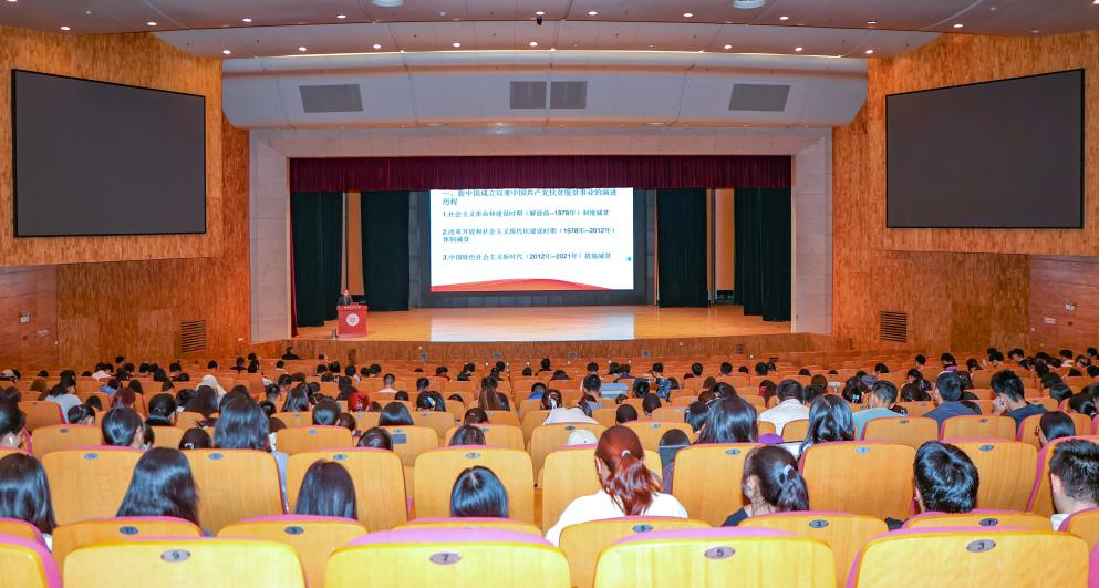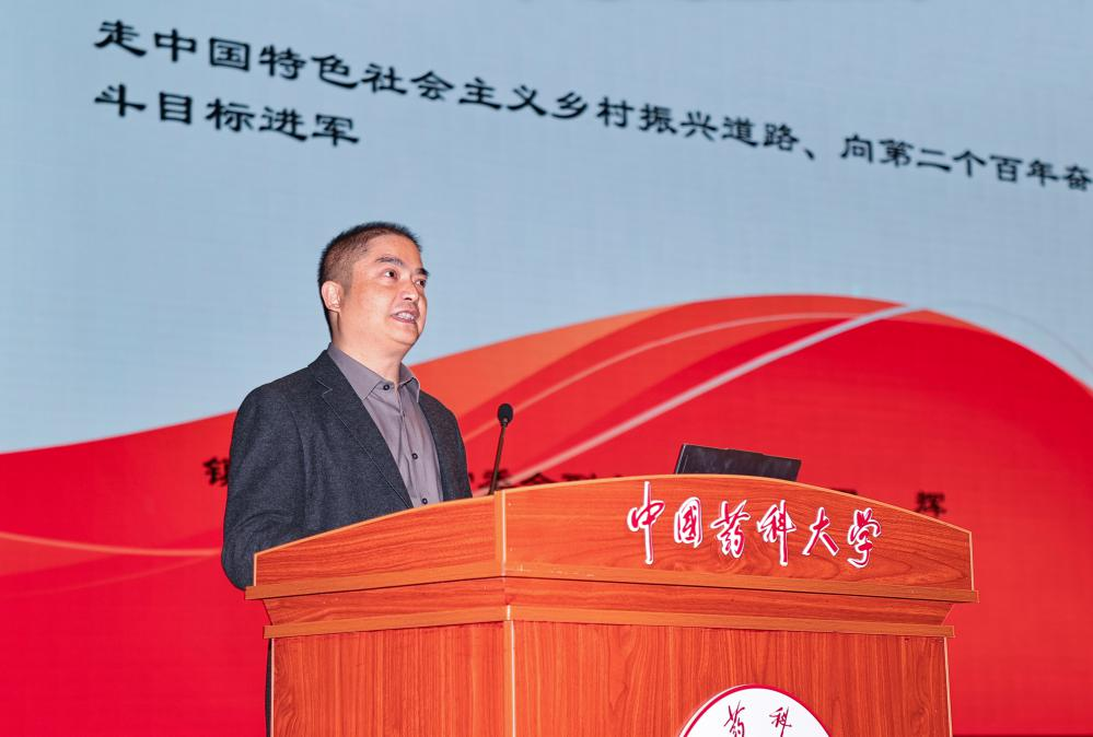 田辉副主任结合自身经历,以《走中国特色社会主义乡村振兴道路、向第二个百年奋斗目标进军》为题,为在场师生们上了一堂生动的思政课。他从大美陕西山峦起伏、斑斓蜿蜒、旖旎如画的秦岭风光娓娓道来,展示了三秦大地上人民群众巩固拓展脱贫攻坚成果铿锵有力的步伐。他表示,自2012年肩负起帮扶镇坪脱贫致富的光荣使命,十年来,中国药科大学真情投入、全力以赴,全校师生齐心协力,内聚合力,外引资源,助力镇坪中药首位产业融合发展,帮助镇坪2018年率先在全市脱贫摘帽。报告中,他着重讲述了“脱贫攻坚战的伟大胜利感悟党的伟力”这一篇章,与在场的师生们一起回顾了新中国成立以来在中国共产党领导下扶贫脱贫事业的演进历程,深刻阐述了脱贫攻坚战的全面胜利是诠释“马克思主义为什么行”“中国共产党为什么能”“中国特色社会主义为什么好”的生动实践。会议最后,他还与同学们分享了自己参加全国脱贫攻坚总结表彰大会感受并现场互动,鼓励大家志存高远、脚踏实地,将专业学习与社会发展相结合,为乡村振兴贡献澎湃的青春力量。