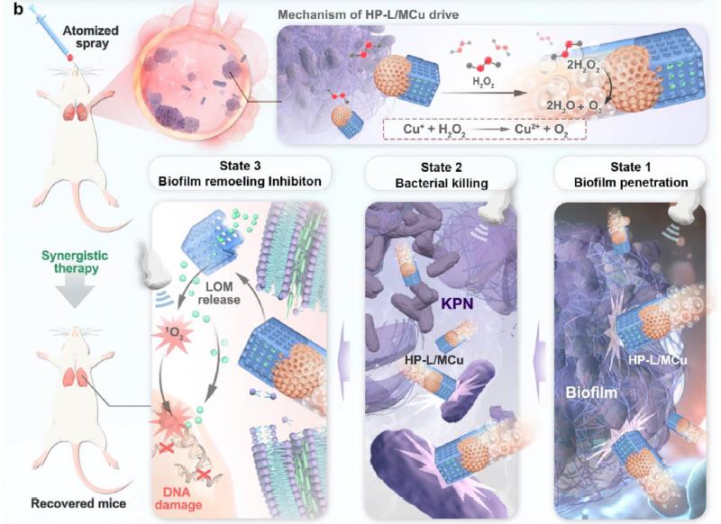 受噬菌体入侵机制启发,本研究开发了一种集成声敏抗生素的仿生纳米马达,用于治疗多重耐药肺炎克雷伯菌诱导的肺部感染。纳米马达具有不对称异质结构,具体为中空介孔普鲁士蓝-洛美沙星/介孔CuxO(HP-L/MCu)Janus 纳米颗粒。它可以综合机械能和化学作用靶向和破坏细菌生物膜,纳米马达的创新设计利用了两个级联作用:一是CuxO纳米球联合微环境中H2O2自主产生推进力,实现对生物膜的动力穿透和物理破坏;二是中空介孔普鲁士蓝结构达成抗生素上载与释放,超声则可激活抗生素产生细菌毒性单线态氧(1O2),对细菌DNA造成不可修复的损伤,增强疗效。研究表明,这种将物理性能与化学作用相结合的仿生联合治疗策略,可缓解生物膜相关引起的耐药性。