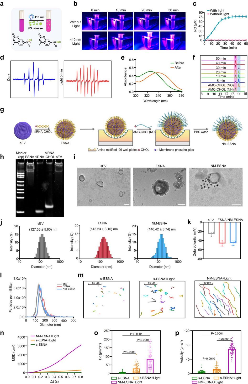 该团队开发了一种无创、光控、具有强组织穿透能力的外泌体透皮系统。该纳米系统以外泌体为核心,以靶向真皮层过度表达的基质金属蛋白酶1(MMP1)的siRNA为外壳,形成了具有立体结构的外泌体球形核酸(ESNA),增加了组织穿透能力,进一步将可见光响应的产气分子不对称修饰在ESNA的表面,形成基于外泌体的球形核酸纳米马达 (NM-ESNA),光照下产生气体梯度作为驱动力,赋予NM-ESNA优异的光控运动性能和透皮性能。相关成果以题为“Light-controlled small extracellular vesicle-based spherical nucleic acid nanomotor for enhanced transdermal delivery against skin aging”发表在学科顶尖期刊Nano Letters上,工学院李斯文教授为本文通讯作者,2021级博士研究生李钰为本文第一作者,中国药科大学为唯一通讯单位。