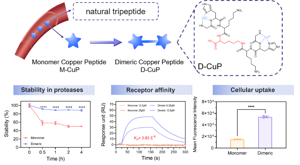 针对上述问题,涂家生/姜雷团队一直致力于新型脂质材料树状脂肽的研究,运用氨基酸为基本结构单元的树形多肽作为脂质材料的亲水基团。针对多肽分子稳定性差的问题,提出“二聚化多肽策略”,可显著提高多肽的稳定性、增强受体亲和性并诱发多价性效应,实现代谢型伤口的高效愈合。相关成果以“Dimeric Copper Peptide Incorporated Hydrogel for Promoting Diabetic Wound Healing”为题发表在权威期刊Nature Communications。2024级博士生丛瑞、2020级硕士生邓成宇与2023级硕士生李鹏伟为论文共同第一作者,药学院涂家生教授、姜雷副教授和南京大学蒋锡群教授为论文通讯作者,中国药科大学为论文第一通讯单位。