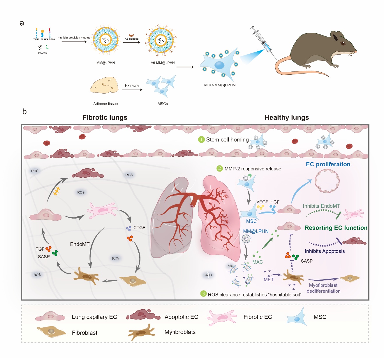 肺纤维化是一种进行性疾病,主要表现为呼吸系统损伤和肺组织功能修复障碍。肺血管生态位通过血管分泌因子在调节肺泡再生中起着至关重要的作用,然而肌成纤维细胞和血管内皮细胞之间的恶性串扰导致纤维化区域肺毛细血管的显著缺失,加剧肺纤维化进程。针对这一问题,该团队基于前期干细胞工程化技术(Sci Adv, 2020, 6: eaba3167;Sci Adv, 2023, 9: eadg5358)的基础上,开发了一种多功能工程化间充质干细胞(MSC-MM@LPHN),通过MSC膜表面锚定脂质聚合物纳米粒递送药物诱导肌成纤维细胞去分化,减少内皮细胞损伤因子的分泌,以及抑制血管内皮细胞向纤维化表型转化,从而恢复血管内皮细胞功能;同时结合MSC分泌生长因子促进血管生成作用,重塑纤维化区域正常血管结构,促进肺组织再生并逆转肺纤维化。