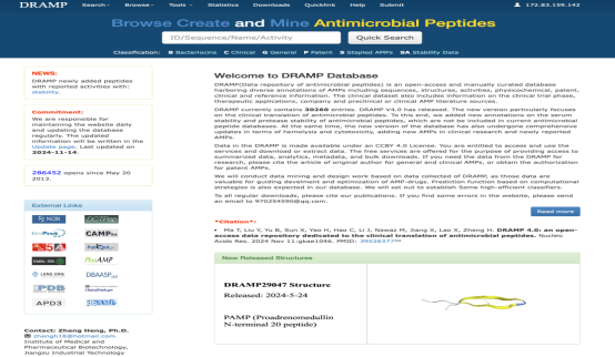 细菌耐药性是当前全球公共卫生领域面临的重要问题之一。抗菌肽具有广谱抗菌活性,作用机制独特,较难诱导耐药,在耐药细菌感染临床上具有重要应用前景,但受限于稳定性、溶血性以及细胞毒性等性质,目前进入临床研究的抗菌肽仍较少。DRAMP(Data repository of antimicrobial peptides, http://dramp.cpu-bioinfor.org/)第4版更新侧重于抗菌肽的临床转化,首次添加了抗菌肽血清/蛋白酶半衰期稳定性数据,并补充了大量实验测定的抗菌肽溶血/细胞毒性数据。除此以外,本次更新新增了8000多条抗菌肽条目,包括来自中文文献的抗菌肽信息。这些信息和数据可以免费从数据库的download界面下载,可用于促进人工智能辅助的抗菌药物设计。