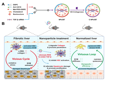 针对纤维化肝脏内“活化的肝星状细胞-受损的肝实质细胞”相互作用构成恶性循环的病理特点,姜虎林教授团队构建恶性循环逆转型药物递送系统,抑制TGFβ信号通路和抗氧化应激,从而抑制肝星状细胞活化并修复受损肝实质细胞,有效调控肝纤维化病理微环境。相关工作以“Pathological Microenvironment-Remodeling Nanoparticles to Alleviate Liver Fibrosis: Reversing Hepatocytes-Hepatic Stellate Cells Malignant Crosstalk’’为题发表在Advanced Science上。药学院博士生张凌烽、硕士毕业生邓文琦及王兴欢为共同第一作者,姜虎林教授为本文唯一通讯作者,中国药科大学为唯一通讯单位。