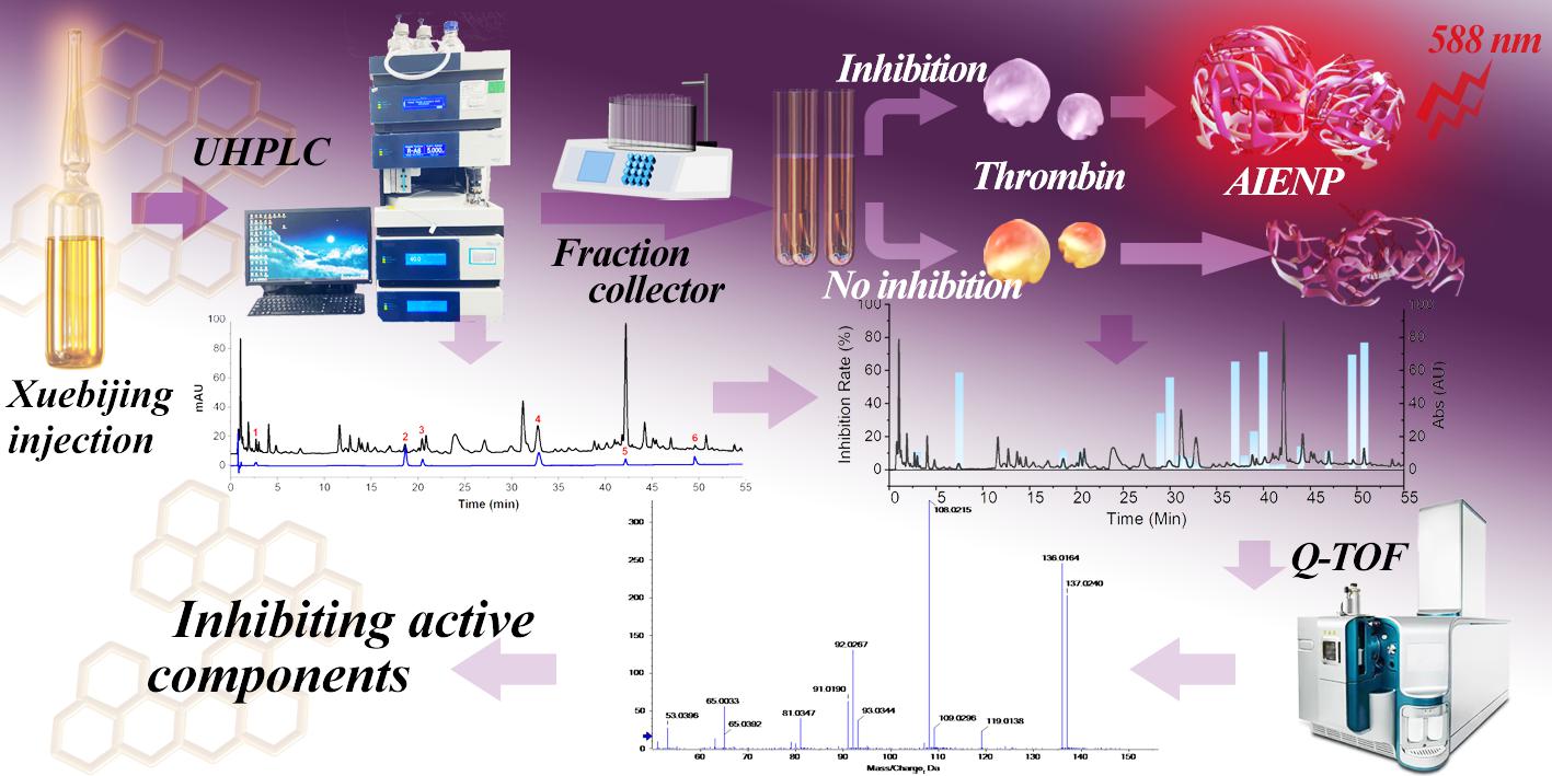 中药复方是中医在临床应用中的主要形式,中药复方的药效物质辨识一直是研究难点。团队开发了一种基于聚集诱导发射(AIE)的荧光探针(图2),用于监测凝血酶活性。该探针进一步与超高效液相色谱-馏分收集器(UHPLC-FC)和超高效液相色谱四极杆飞行时间质谱(UHPLC-Q-TOF/MS)相结合,建立谱效导向策略对血必净注射液中凝血酶抑制剂进行分离、制备、筛选和鉴定。最终成功获得6个具有较高抗凝血活性的化合物(没食子酸、绿原酸、氧化芍药苷、咖啡酸、洋川芎内酯I和丹酚酸B),总体抑制率约为血必净注射液抑制率的60%。这一成果为中药复方的药效物质辨识提供了新技术和方法。相关研究以“An Aggregation-Induced Emission Sensor Combined with UHPLC-Q-TOF/MS for Fast Identification of Anticoagulant Active Ingredients from Traditional Chinese Medicine”为题发表在Analytica Chimica Acta上(全文链接:https://doi.org/10.1016/j.aca.2023.341799)。中药学院硕士研究生李子怡为论文第一作者,中国药科大学为第一通讯单位。