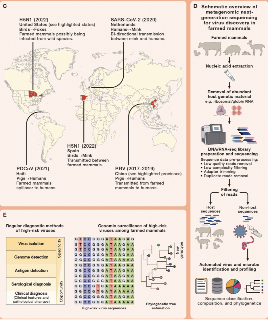 本论文系统分析和总结了与人密切接触的养殖哺乳动物携带病毒的多样性及其在动物间以及动物和人之间的跨宿主传播风险,并提出了针对禽流感病毒(人兽共患)和盖塔病毒等风险病毒的前沿监测方法和防控建议。