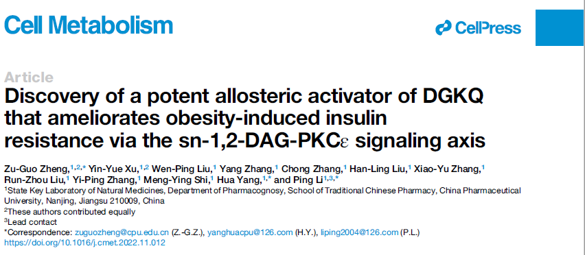 2022年12月16日,Cell Metabolism刊登了中国药科大学天然药物活性组分与药效国家重点实验室李萍/杨华/郑祖国团队的题为“Discovery of a potent allosteric activator of DGKQ that ameliorates obesity-induced insulin resistance via the sn-1,2-DAG-PKCε signaling axis”的最新研究成果。